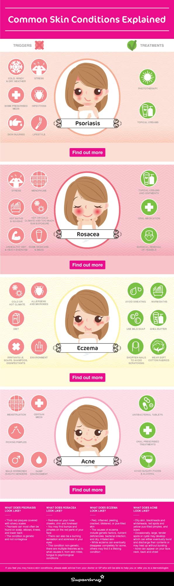 The skin is there to shield us from the elements, but it’s not impenetrable and can react in a variety of ways. Whether you’ve already identified with a skin condition or have recently noticed your skin flaring up uncharacteristically, our info-packed guide explores the most common skin conditions: psoriasis, rosacea, eczema and acne.