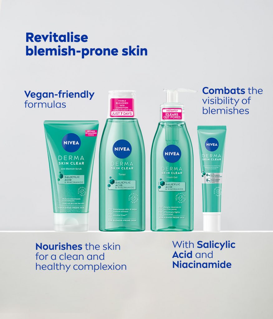 Finding the perfect range of skin care products for blemish-prone skin can be an overwhelming task. The NIVEA Derma Skin Clear Range, consisting of four vegan-friendly formulated skin care products, combats the visibility of blemishes and further nourishes the skin for a clean and healthy complexion. The NIVEA Derma Skin Clear Range combines the three main ingredients; Niacinamide, Salicylic Acid and Glycolic Acid, which are known ingredients used to help revitalise blemish-prone skin.